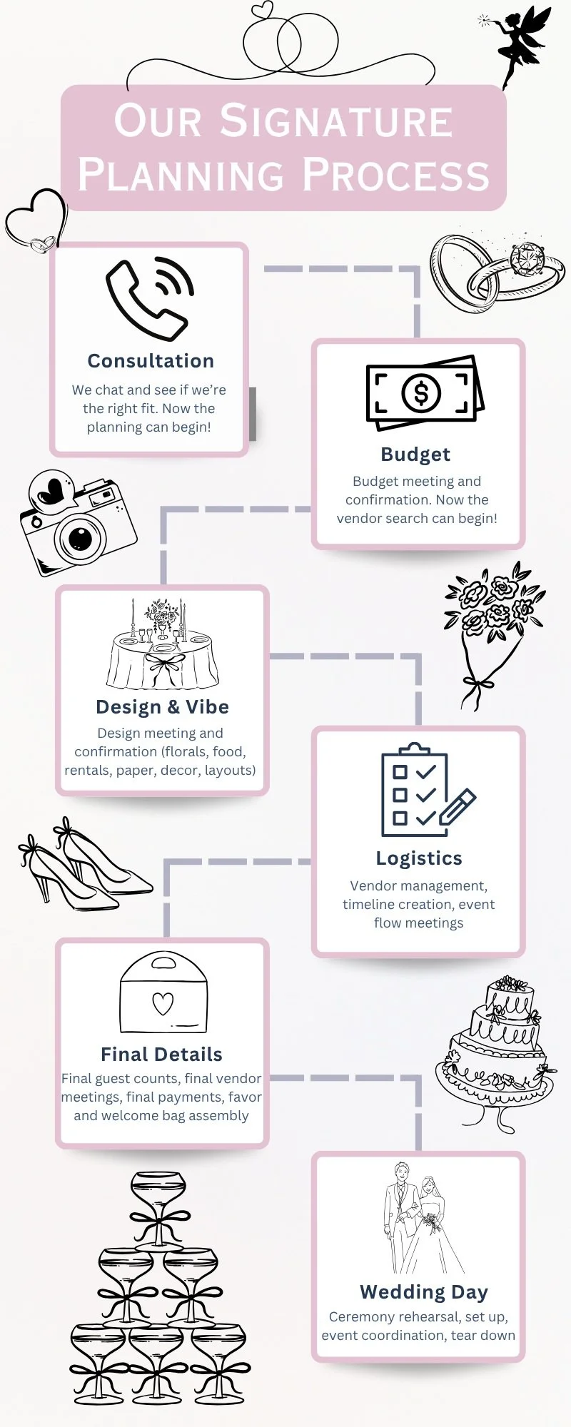 We believe that the planning process should be structured, systematic, organized, and stress free! That’s why we’ve designed a signature planning process. We’ve got your back every step of the way.